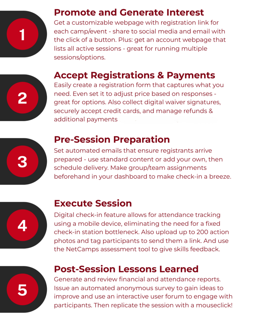Camps. Leagues. Trainings. Events. If it requires a registration to attend, NetCamps helps make it awesome and easy.